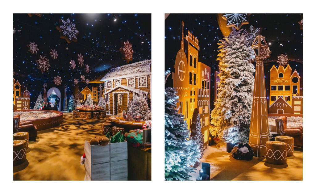 "Because the star drop covered all hanging points in the ceiling, and I couldn't cut into it to get to the tent structure, I had to get creative when installing all the small fixtures to light areas such as Santa Claus and the gingerbread house," Ray says. "To create an invisible structure, we installed cables pulled tight across the ceiling and affixed our fixtures to that."